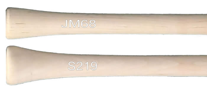 bat and without the knob restricting your swing, you should be able to generate significant more bat speed. The JM68 has a 15/16" handle and smaller knob. The S219 has a 1" handle with a larger knob. Barrels are 2.5" diameter on both.